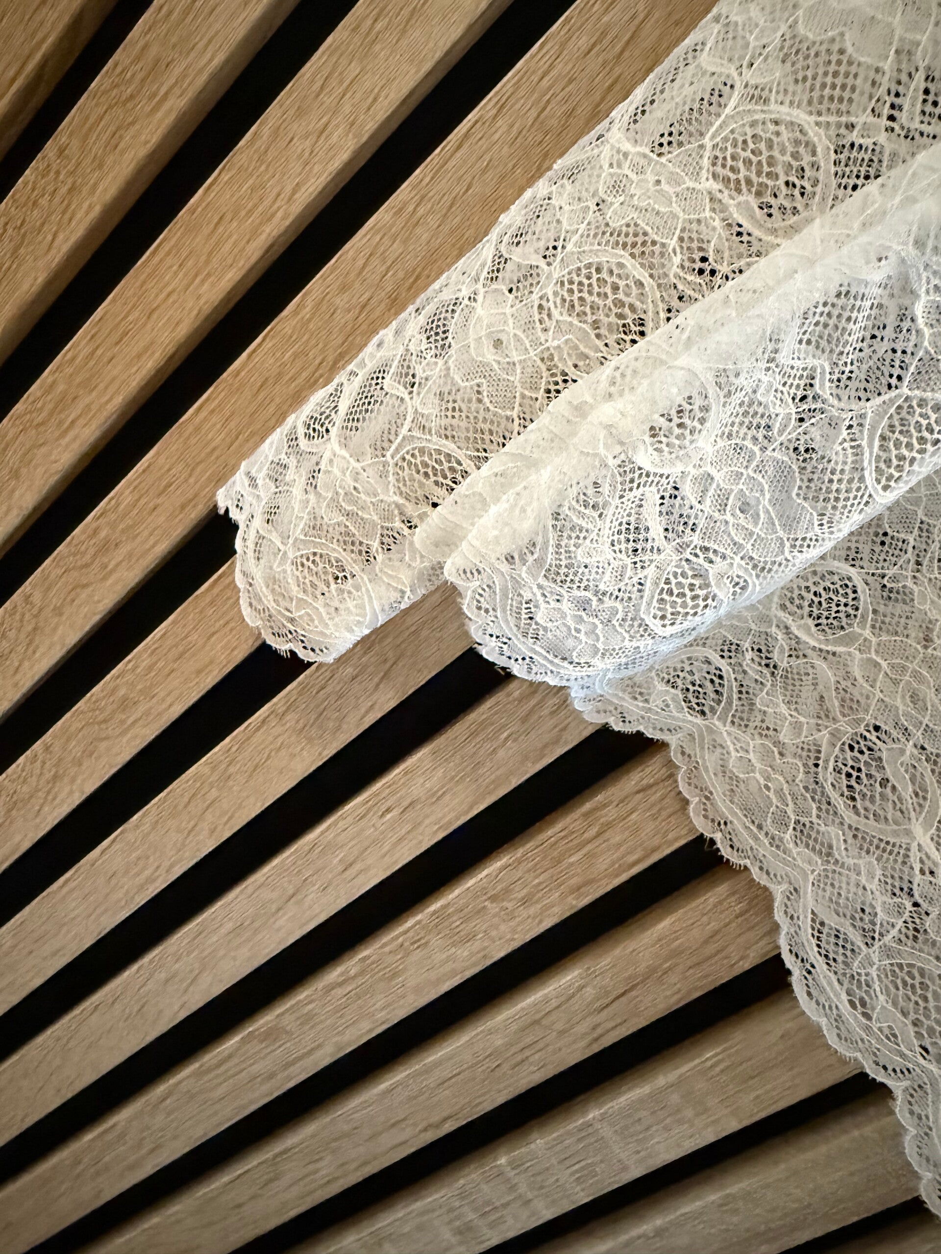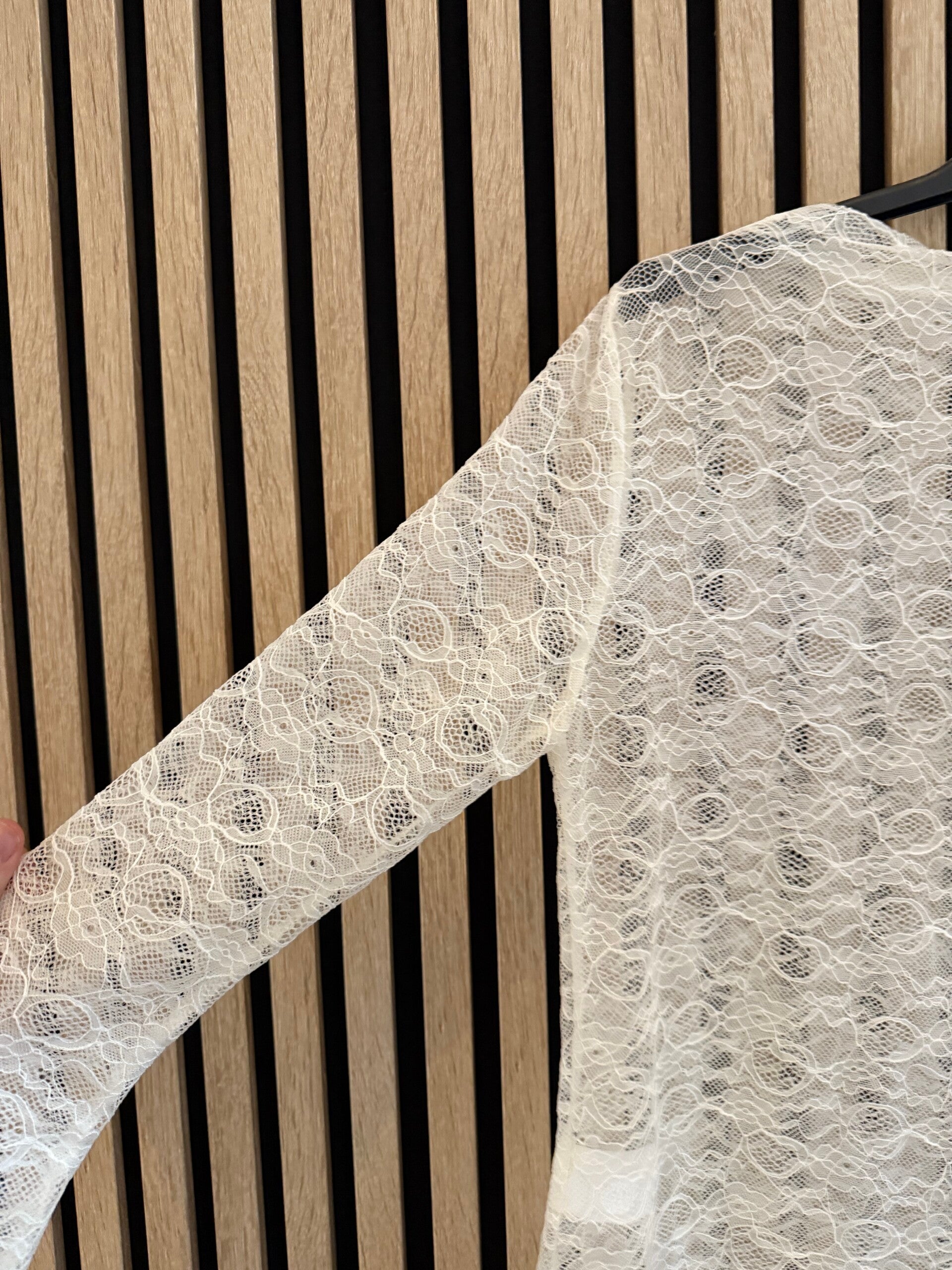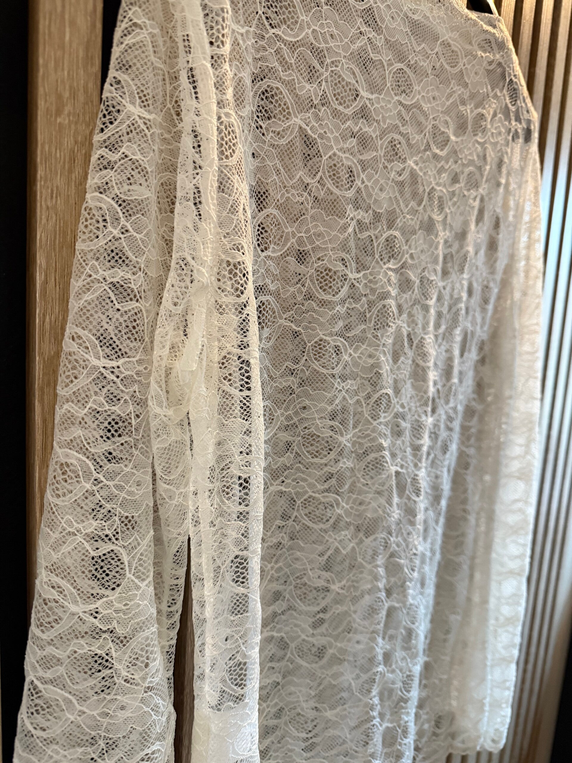 De witte variant heeft romantische kanten details, maar met een iets subtielere mouw voor een zachte, elegante uitstraling.